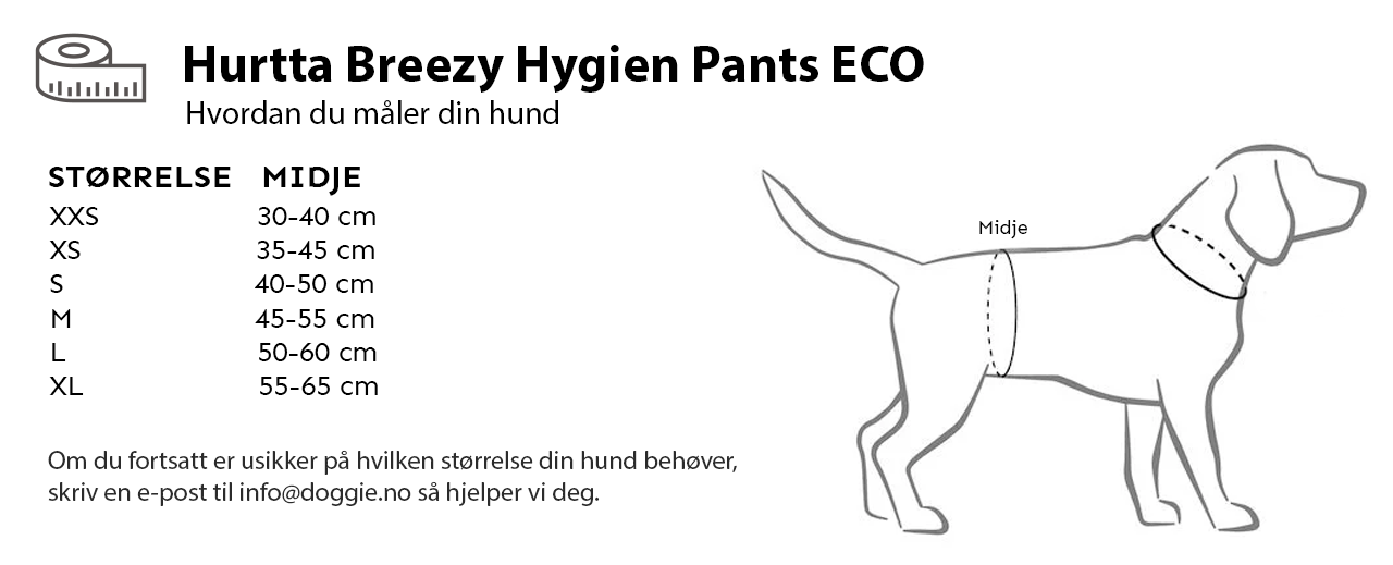 Breezy Hygiene Pants ECO er det ideelle valget for hunder som slapper av hjemme eller deltar i sportsaktiviteter når de er i løpetid. Disse buksene har en minimalistisk design som gjør dem så diskrete som mulig, samtidig som de fokuserer på passform og komfort, slik at hundens naturlige bevegelser ikke blir begrenset. Den oppdaterte versjonen av Breezy Pants ECO er et nytt tilskudd til vår miljøvennlige Hurtta ECO-serie, og fungerer som et beskyttende plagg for tisper uten behov for separate engangstruser.