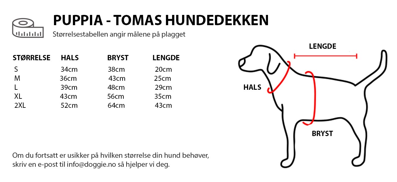 For å velge rett størrelse til din hund, legg til 5-10 cm på målet du får når du måler rundt brystkassen til hunden. For ordentlig små hunder under 5 kg er det nok med ca. 3-5 cm. Tenk på å ta en størrelse større dersom hunden har mye pels. Målene som oppgis i størrelsestabellen er målene til plagget.