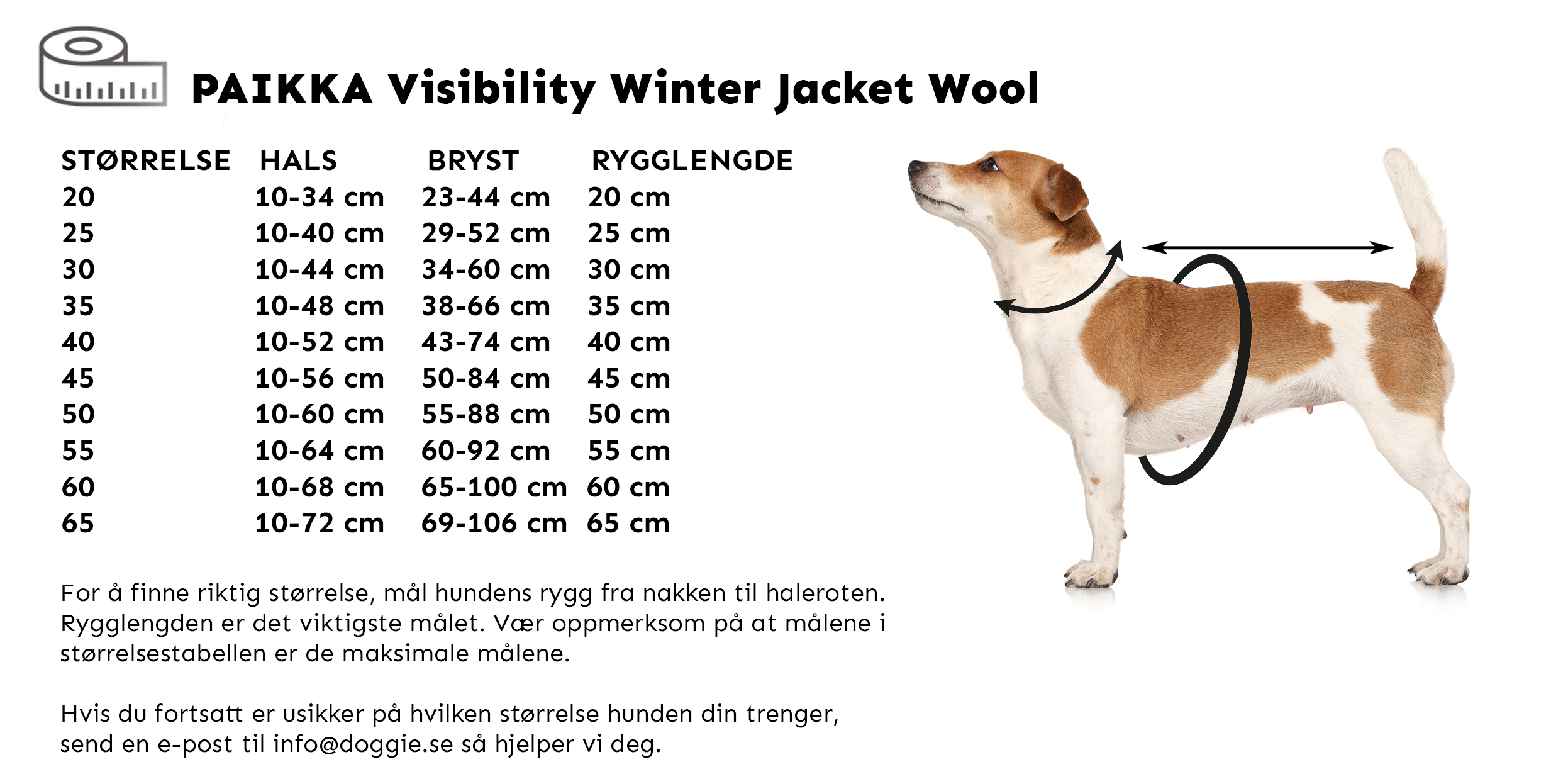 Mål hundens rygg fra nakken til haleroten. Hvis hunden er mellom to størrelser, anbefaler vi å velge den større størrelsen. Merk at målene i størrelsestabellen er de maksimale målene. Rygglengde, halsomkrets og belte kan justeres noe.
