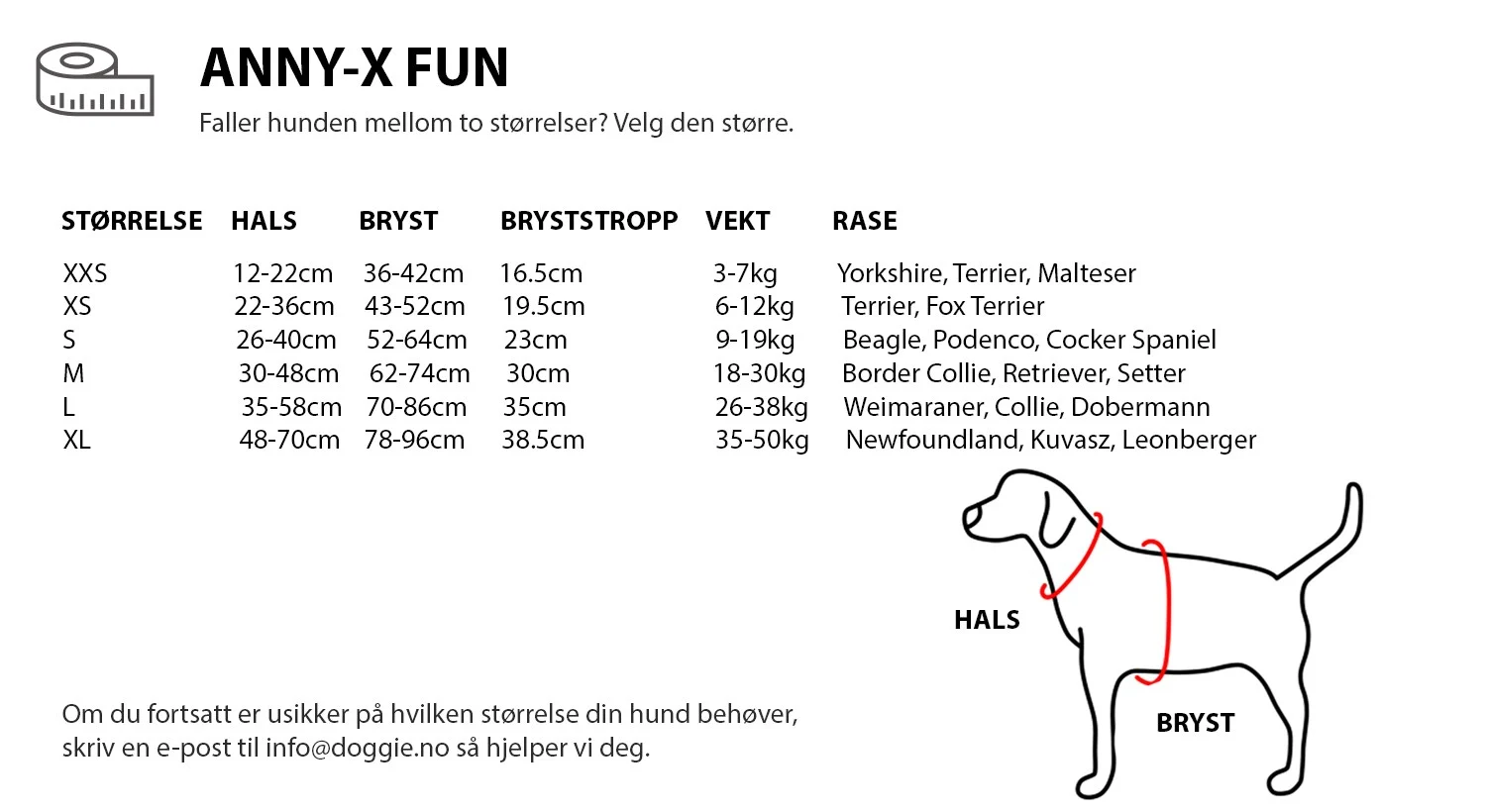 | STØRRELSE | HALS | BRYSTKASSE | BRYSTSTROPP (STROPPEN MELLOM BEINA) | VEKT | HUNDERASE |