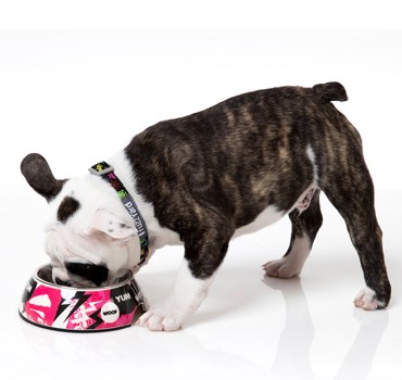 Tøft tegneseriemønster med "WOOF" og "YUM" langs kantene. Avtakbar innerskål av metall for enkel rengjøring og påfylling.
